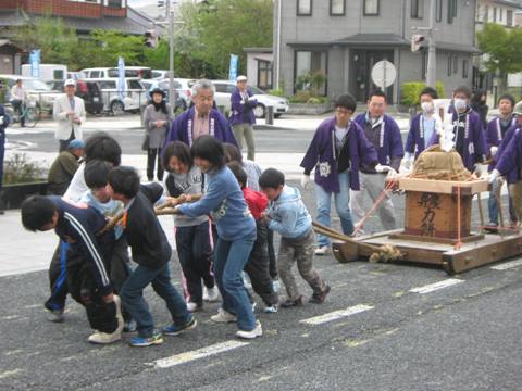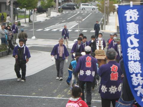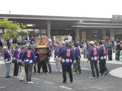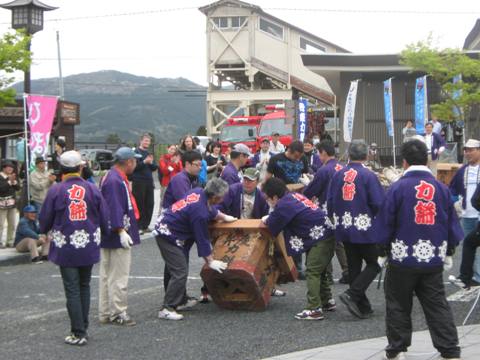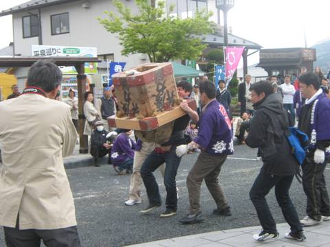 世界遺産登録で沸く平泉。GWは毎年藤原まつりが開催されますが、その最後を飾るのが平泉駅前で行われる弁慶の力餅競技。昭和元年から始まり今年(2012年)第87回と言う歴史あるイベントです。持ち上げイベントは全国各地にありますが、ここは重さ一辺が1mぐらいある巨大な三方の上に乗った餅米を三方ごと持ち上げ、どれだけの距離歩けるか、というルール。重さは160kgとのこと。腰に膨らんだ廻しを締め、その上に保存会の人たちが6,7人がかりで三方を持ち上げて逆さまに乗せます。手を離してスタート。予選通過ラインは10m。約20人が挑戦し、2回試みて通過者はわずか6名。過去最高は70数mだそうです。この日は最高が27m、続いて26m。午後からは決勝で、全員が2度ずつトライ。47年連続出場という人もいて、今年66歳。それで160kgを持ち上げたばかりか10m歩いちゃうんだからお見事。優勝は予選1位の人で32mでした。表彰式の後、最後に餅まきがあり、めでたく祭りは終了。(2012. 5. 3)