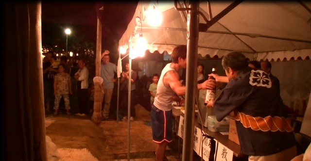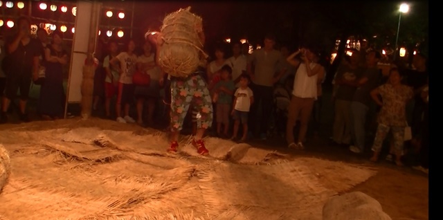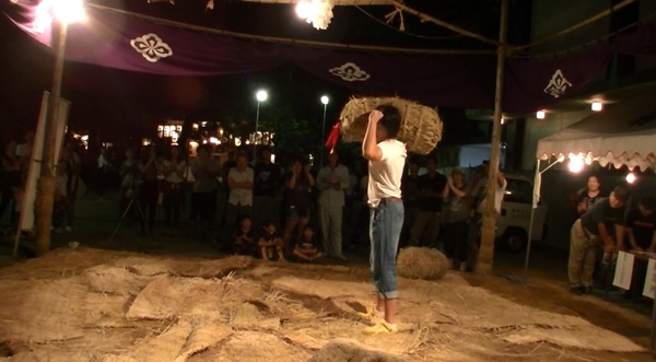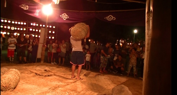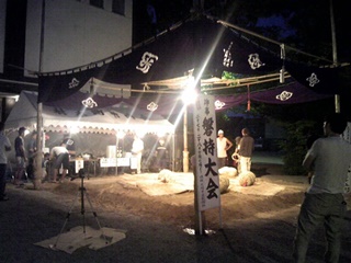 行事の開始は午後6時。少し前まで子供の奉納相撲が行われていた、境内に作られた土俵が会場である。