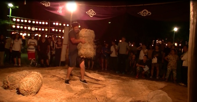 アナウンスが終わり、挑戦者が土俵に登場。米俵の持ち上げにかかる。持ち上げの大会は全国何ヵ所かにあるが、それぞれ成功の基準が異なる。