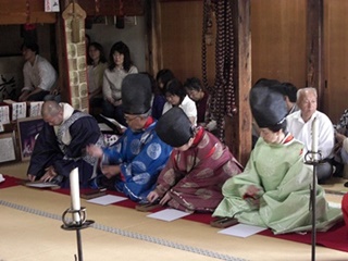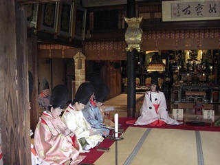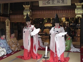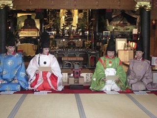 京都市東山区の法住寺で、日本今様歌舞楽会主催の今様合わせの会が行われました。 今様は平安時代に流行した歌謡で、七五七五七五七五でできています。後白河法皇の「梁塵秘抄」が有名です。 左右に4人ずつ歌人が並び、まず白拍子たちによる奉納舞。続いて本日のお題が披露され、 歌人たちに硯と色紙が配られます。歌人たちが今様を色紙に書き、書き上がると集められます。 左方右方一つづつ読み上げ、これに白拍子が即興の舞を付けます。