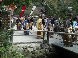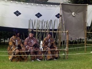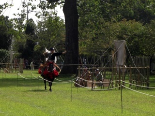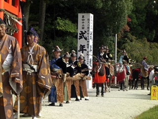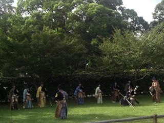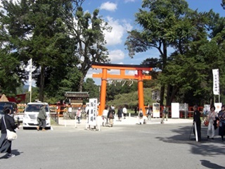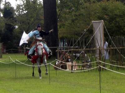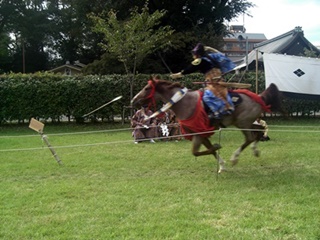 京都市北区の上賀茂神社で、大日本弓馬会による笠懸(かさがけ)が行われました。 笠懸は馬上から的に向かって矢を射るもので、流鏑馬に似ています。 流鏑馬の方がやや儀礼的だそうですが、笠懸は日本でも2か所ぐらいしか行われていません。 由来は懸けた笠だそうですが、その後は板や陶製の的が用いられました。 流鏑馬は左側にしか的を設けませんが、今回の笠懸は的が右側にもあり、射手は両側に射る ので大変だそうです。近くでしか撮影できないのでカメラが追い付かず良い撮れませんでした。往路では左側に3か所の的、復路では右側に一か所、左側に一か所の的があります。 今回の射手(いて)は9名。5名と4名に分かれて行い、上位5名が決勝進出となりました。 最初は正方形の木の板、決勝は陶製の皿状のものを2枚合わせた的が用いられました。 (2016.10.6)