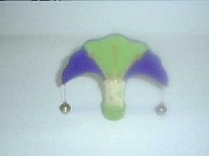 歴史的な資料では蝶、花、的などと呼ばれています。当初は「文銭十二枚を芯に、銀紙でくるみ、金銀の水引をかけ」たものが使われていました。二度目、三度目の流行の折には、「蝶の形や銀杏の葉の形」をし「両端から鈴を垂ら」したものに変わりました。最近市販されているものも、皆、この後者の形をしています。