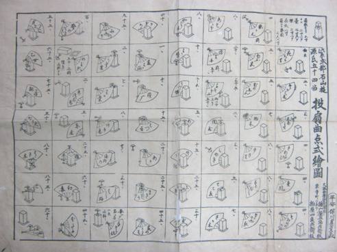 1枚の紙に役と点を示したものです。 点式図1 点式図2 点式図3 点式図4 ※投扇曲と記載されています 点式図5 ※投曲扇と記載されています 点式図6 ※遊扇競と記載されています 点式図7 ※投扇競と記載されています 点式図8 点式図9 点式図10 ※歌川春貞画と書かれています。 点式図11 点式図12 *本サイトの内容の無断掲載、転載、引用、複製を禁じます。 (c) Hironori Takahashi