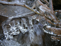 | そんな訳で、北割Hさんにお願いして同行させて頂くことになった。当日は出張明けから間もなかった事もあって 前夜出発は控え、当日早朝に自宅を出発。目的の場所までは高速を使って1時間ちょっと。朝が早いので 道も空いていて楽チン。待ち合わせ場所に到着して一息付いていると北割Hさん到着。コンビニに寄って早速釣り場 へ。釣り場へはほんの10分ほどで到着してしまうが、まだ辺りは真っ暗に近い状態。しばらくの間車の中で身支度を 整える事に。辺りが明るくなり、やや雪の残る山道を歩いて入渓点へ向かう。解禁日なのに人の気配ゼロ。安曇野 周辺の渓ではとても考えられない光景だ。まさに貸しきり状態で初釣りはスタート。小渓ながら、何と水が綺麗な こと。こんな(と言っては失礼だが...^^;)小渓に良型のアマゴがいっぱい居ると思うと嬉しくなってくる。 |
