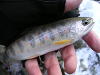 釣り場は小堰堤にて1stステージを終了するが、その前にビッグなアマゴが竿を絞った。このポイントも北割Hさん に譲って頂いた。(^^;、小さな淵の落ち込みのど真ん中、一番水深がある所の底からそのアマゴは上がってきた。 3投目くらいだったろうか、1mちょいの提灯仕掛けがググっと水中に引き込まれた。 その瞬間にかなりの大物と思い、背中のタモを引き寄せる。タモに収まったのは25cmの幅広アマゴ。ほとんど 錆びはなく、下あごがグッと反り返った厳つい顔つきのオスだ。このサイズになると、ヤマメやアマゴはこんな 顔つきになる。僕にとっては年に1,2尾のビッグサイズ。北割Hさんに感謝感謝、シェシェ。 2ndステージは思った釣果を得る事は出来なかったが、納竿までのんびりと渓と戯れる事が出来た。安曇野の渓での 初釣りはほんとのチョイ釣りだが、今日はとてもゆっくりと釣りを、渓を楽しめた。 昨年に引続き今年も多忙な1年になろうと思われるが、ベストシーズンにはぜひ遠征もしたい。毎週とはいかなまでも 月に1度は釣りへ出掛けられたら良いなぁと思う。今年も良い1年になりますように!(^^)/ |