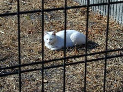 ちょっと遠くの遊歩道にいるネコさん。警戒心強く、にらんでいます。この辺のネコは皆汚なげ。病気なのかしら。