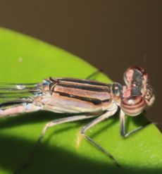 写真右:ホソミイトトンボ♂(野々下)頭部。眼後紋が繋がる。これも特徴だが光が乏しい林の中で小さなイトトンボのこの部分を確認するのはそう簡単ではない。