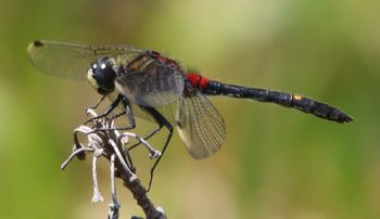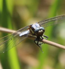 写真左:シオヤトンボ♂(大沼)湿地の水溜まりで縄張り行動していた。カオジロ交尾ペアが止まると追い出してしまった。