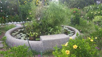 写真:水生植物の水槽(新生公園)こんな小さな水辺もトンボポイント。ヒメトンボの♀が近くに止まっていた。
