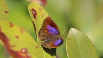ムラサキツバメの♀が葉の上で開翅していたのですぐに見つけることができた。