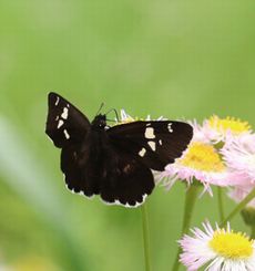 写真左:ダイミョウセセリ(理窓会公園)ヒメジョオンの花で吸蜜。