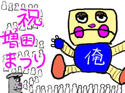 ちか:本当に人たくさんいたね \(^o^)/ ぷ〜:始発前から並んでた人いるらしいからね・・・ (^o^) ちか:3時間ぐらい暑い中待ってたからね ヽ(^o^;)ノ ぷ〜:おかげで焼けちゃったよ・・・ o(><;)(;><)o ちか:じゃあ、来年は徹夜だね (o^v^o) 解説 What's 増田まつり 増田まつりとは、神奈川を中心に局地的人気を誇る「Saku Saku」(テレビ神奈川)の人気キャラ「増田ZIGORO」に絡みたい人々が集結する、(本来は)スケールの小さなイベント(のはず)である。(実際には、番組の小道具が飾ってあるだけ。) テレビ神奈川という、神奈川県内でも受信できる地域が限られるという超ローカル局の番組ながら、芸能界に多数のファンがいるという噂。 事実、人気アーティストの「aiko」もZIGOROの大ファンだと語り、ゲスト出演。ある筋の情報からは、KinkiKidsの堂本剛も注目しているとのことである。 |