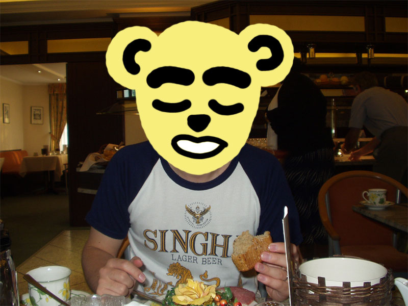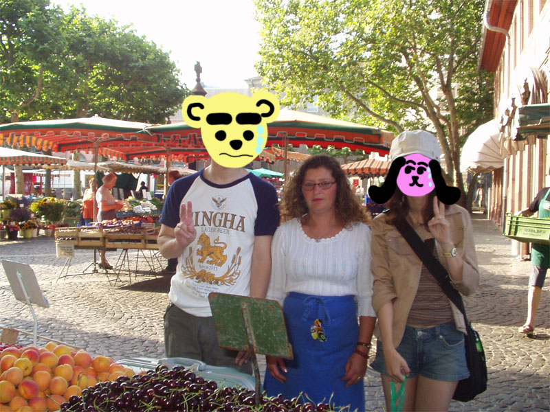 ホテルに戻り、バイキング形式の朝食をとります。朝食もすごいですね。数種類のパンと、数種類のチーズ・ハム類。 パンにチーズやハムがすごく合いますね。(当たり前ですが・・・) 日本のハムやチーズとはぜんぜん違います。クロワッサンは特においしかった。 プーさんも幸せそうな顔してます。(^o^) 朝食を済ませて、部屋で荷物まとめて、チェックアウト。 まずは、大聖堂前でやっている朝市に出かけます。