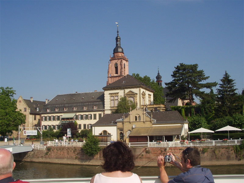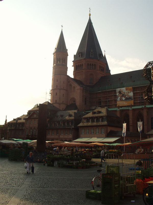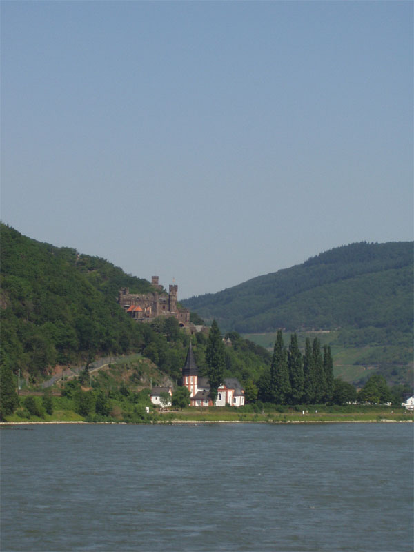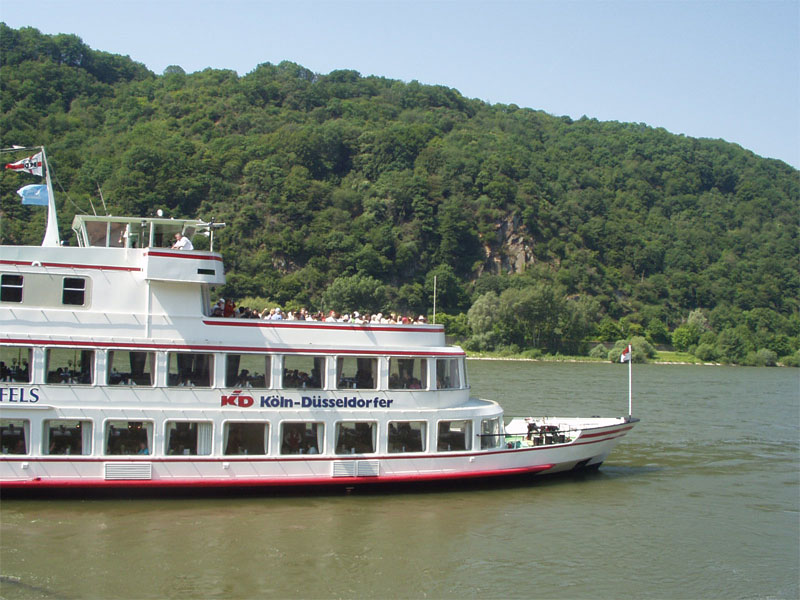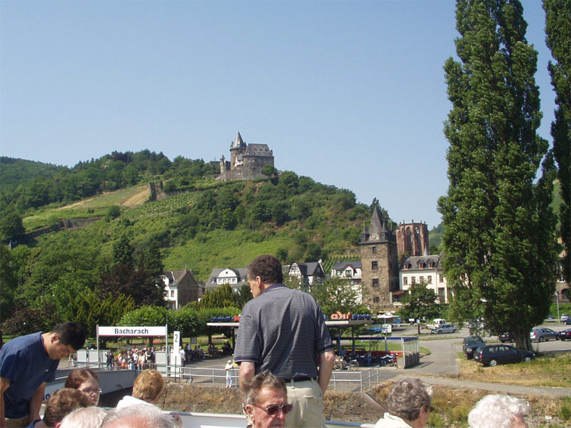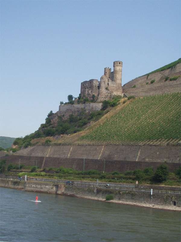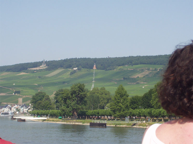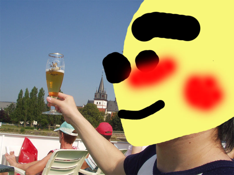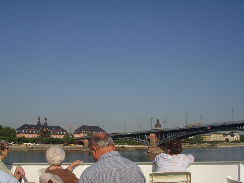 記念にイチゴを買ったお店の愛想の良さそうなおばちゃんと写真を撮ろうとしたら、おばちゃんがカメラマンに・・・。かわりに一緒に写ってくれたのは、なぜかその店の隣のおばちゃん(?)。 皆さん、旅行に行くときは、ちゃんと現地の言葉を覚えましょうね(;^_^A お店のおばちゃん以外、みんな複雑な顔での記念撮影となってしまいました。 (^-^;)v さぁ、気を取り直していきましょう!! いよいよ、この旅の1番の目的だと思う、ライン川クルーズです。 今からは写真をここぞとばかりに撮ってしまったので、文章は少なめになってしまいます。 あらかじめ、ご了承ください。m(_ _)m ちなみにライン川クルーズとは、今回私たちが乗る、マインツからケルンまで出ています。(今回ははコブレンツまで) その途中には、たくさんの町や、古城、ブドウ畑などがあります。 では、楽しいライン川クルーズを・・・(^-^)v