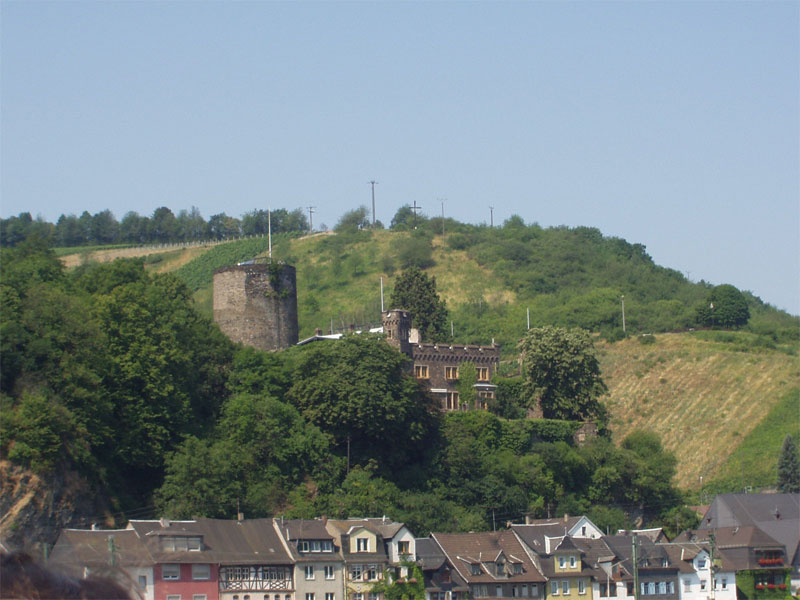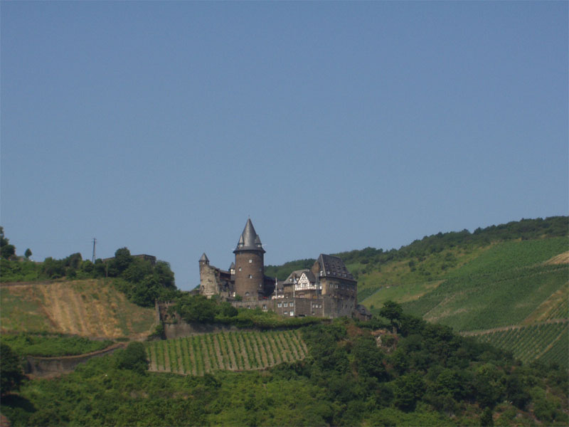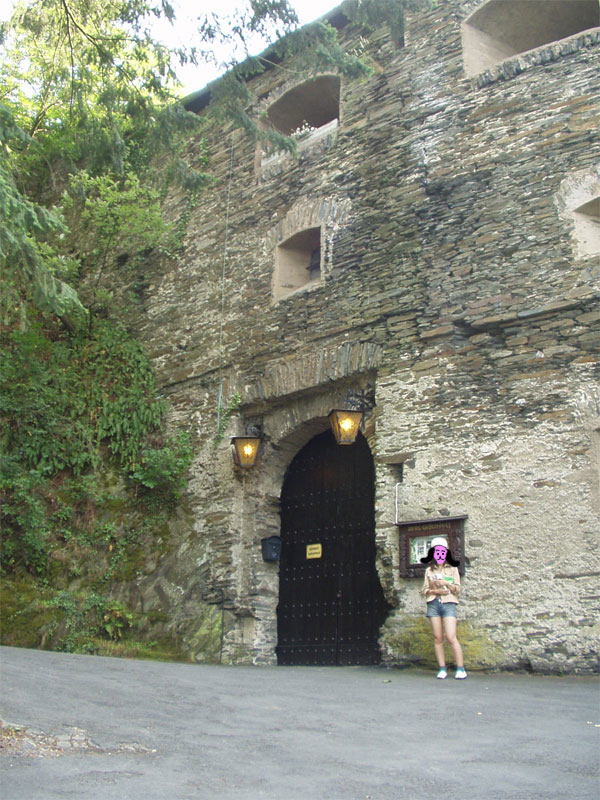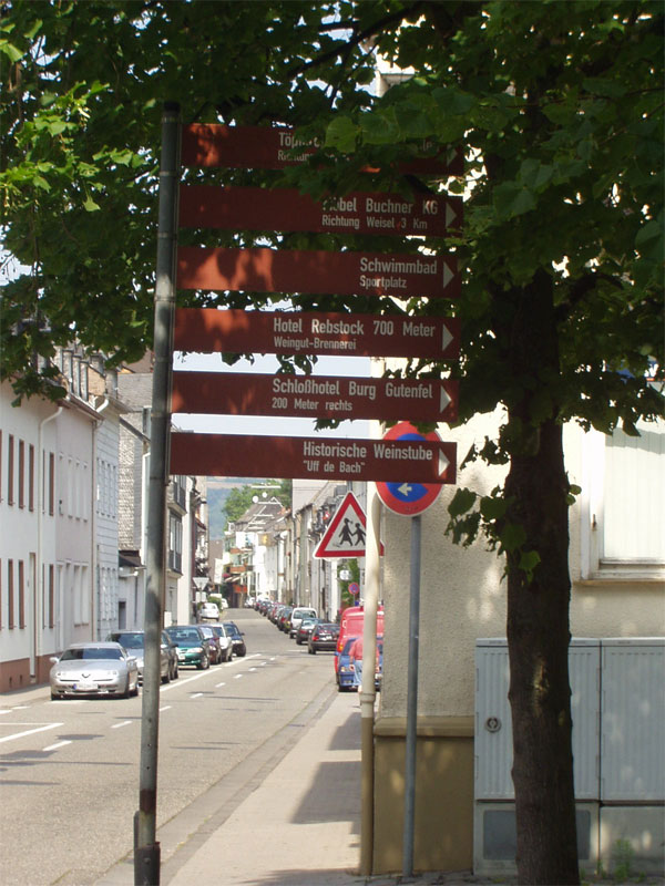 という訳で本日の宿泊場所のあるKAUB(カウプ)に到着。今日は念願だった古城ホテルに泊まることが出来るんです。 山の上のほうに今日泊まるグーテンフェルス城が見える。 だけど、行き方が分からない。近くにはタクシーらしい物はないし、バスらしいものもない。 ホテルの看板をみつけ、そこには200mと書いてあった。しょうがないので大きな荷物を引っ張って歩いていくことに。