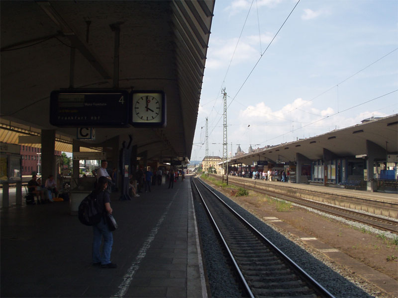 ポテトサラダは日本のものとはぜんぜん違い、黄色の色をしてしかも酸っぱい(^O^; でも白ワインと一緒に食べると意外に合います。でも、途中で飽き80%を残してしまいました・・・。 レストランの方すみませんでした。やっぱり日本のが一番です。 船を下りてライン川とはお別れ(ToT) ここから今晩の宿泊先のハイデルベルクへ向かうため、駅まで行きます。