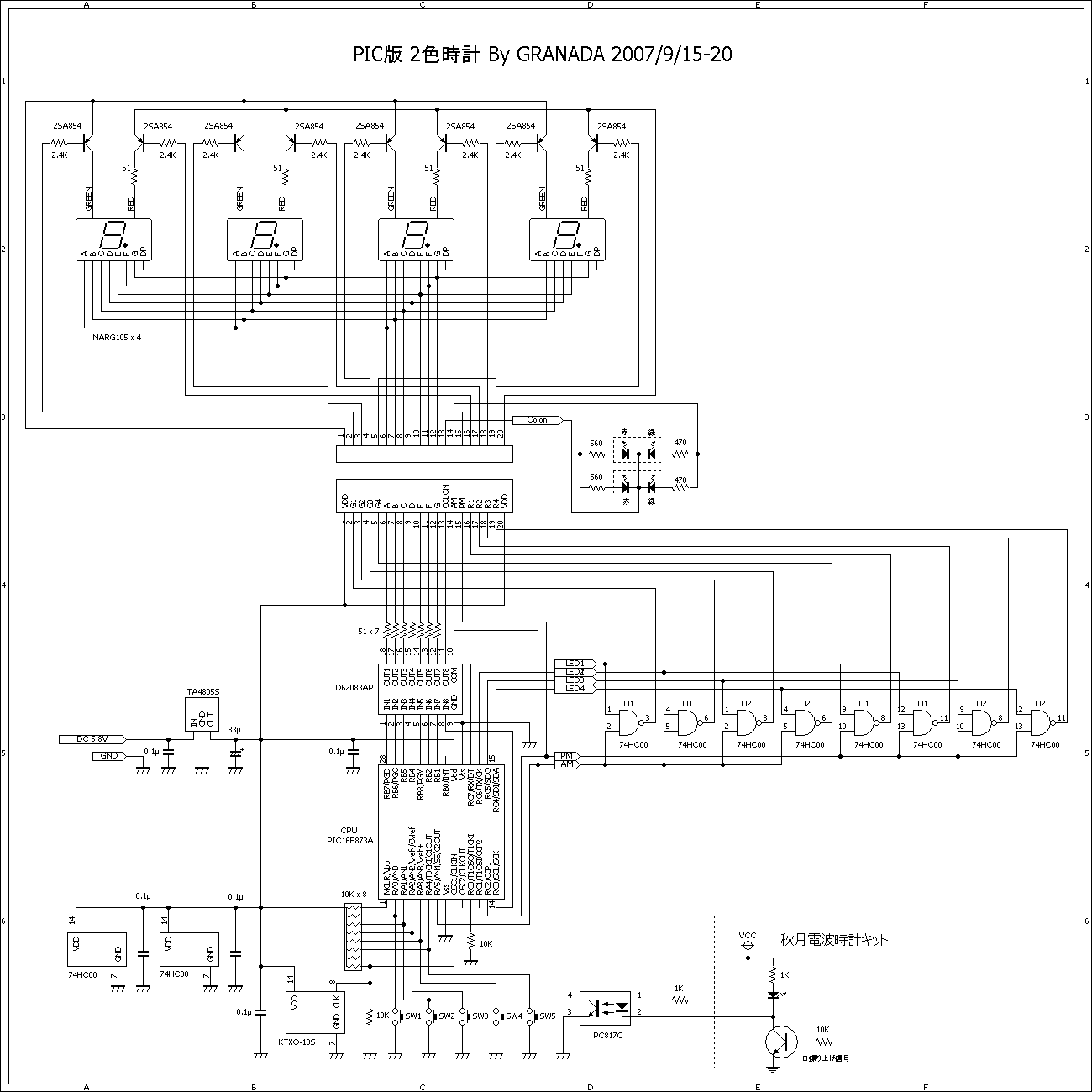 2007年夏、遅まきながら PIC を使い始めたこともあり、PIC 関連のサイト記事をサーフしていたところ、お題に応用可能な先人の知恵を発見したため、2色時計というコンセプトはそのままに、PIC