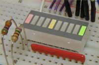 | まずはブレッドボードで動作確認 | 10秒毎に電圧表示に切り替わる。 真中のバーで何%まで充電されたか 表示する。(赤=0%、緑=100%) |