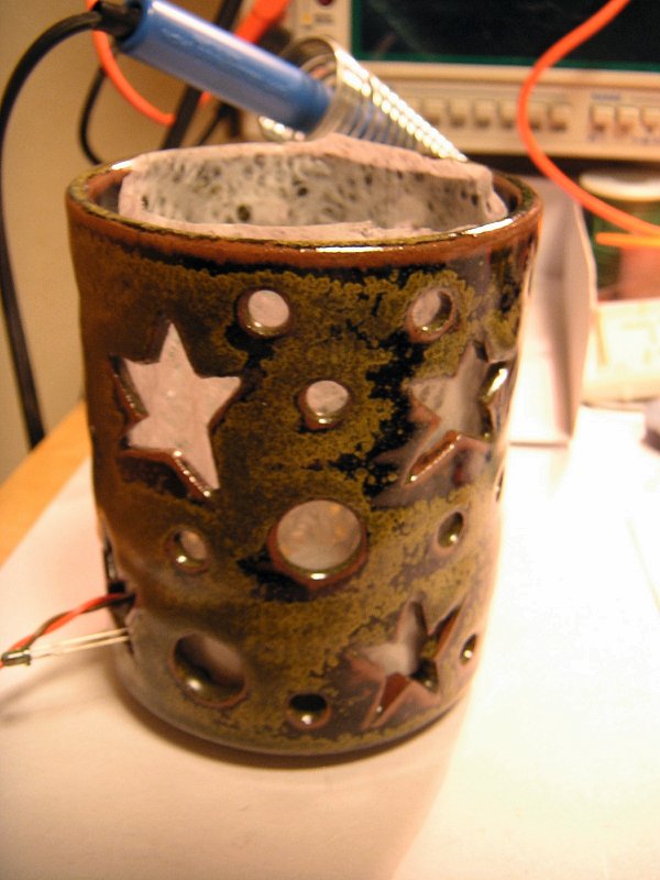 今回の製作に至った発端は、クリスマスに配偶者が LED キャンドル(ホームセンターとかで数百円で売ってるやつね)を買い求めたことであった。普段、管理人の製作物にはまったく興味を示さない配偶者が光モノに興味を示すとは点数を稼ぐ絶好のチャンス。速攻でプロトタイプ(写真参照)を作って配偶者の反応をうかがいつつ(汗)、発展型の製作を目論んでいたところ、都合よく笠間焼のキャンドルホルダーが手に入ったので、本格製作することに。