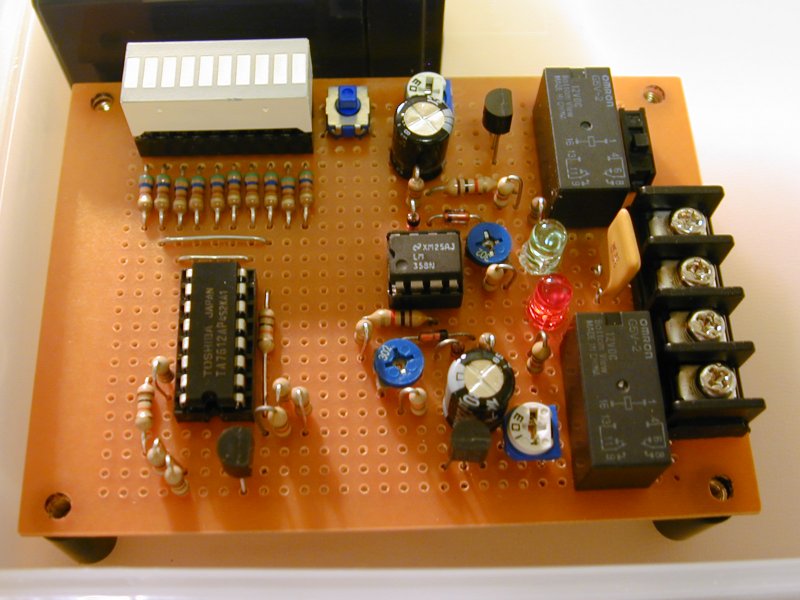 過充電、過放電回路はパワー社刊・「家庭で楽しむ太陽電池工作」に載っているコンパレータを使ったリレー駆動回路を製作。ただしこの回路自体もわずかに電気を食うので、必要な時のみ機能するようスイッチを付けておいた。一方