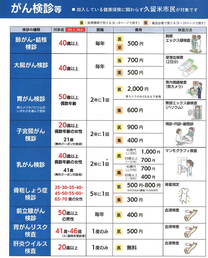 (金額:久留米市国民健康保険加入者(40〜79歳)無料、生活習慣病予防検診(35〜39歳)500円、後期高齢者(75歳以上)500円