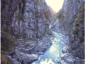 周辺の山脈を大きく侵食し、両岸数十メートルにそそり立つ