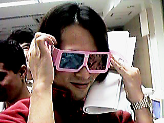 立体視できる図の近くにもたまたま赤と青で表示された図があり、「立体視できん」と大騒ぎ。まぎらわしい展示だ。