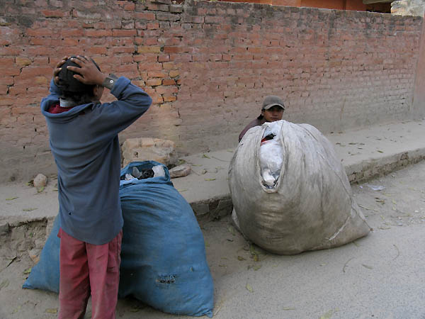 集めたプラスティックをこれから回収所へ持ってゆくストリートチルドレン。