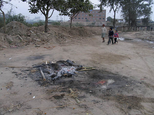 空き地の一角にある焚き火の跡だが、これも火葬のひとつだ。カーストや職業により火葬の仕方も異なり、中には焼かずに森に埋めることもある。