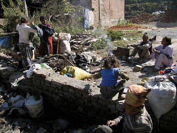 取り壊した家の廃材や家財道具を前に路上での生活を考える一家。この土地も200ルピー/月を支払って借りていたのだが、持ち主が代わり立ち退きを迫られたのだ。
