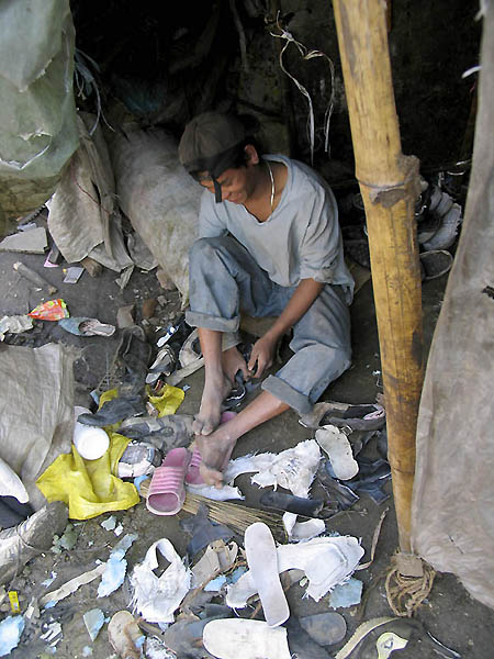 ティルガンガのプラスティック回収所前でお金になるゴム底を靴から剥がす。スンダールは新しい家での新しい生活に張り切って働く。