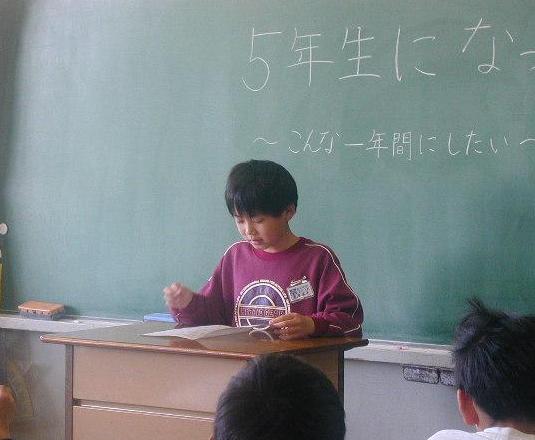 ひとりずつ壇上に立って作文の発表「5年生になって〜こんな一年間にしたい」。