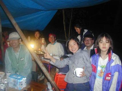 5月3日夜、「おやじの森」でキャンプをしているAOCの仲間から電話、「ビール買ってすぐに来て」。 「えっ、雨降ってますよ」と一瞬たじろぎましたが、写真を撮るべく襲撃をかけてきました。 雨の中、すごい人数で取れたての筍料理で大いに盛り上がっていました。