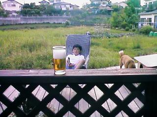 汗を流した後の夕方は庭でビールと焼肉です。