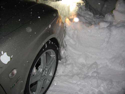 めでたく新品スタッドレス(プラス新品ホイール)になって帰路を急ぐ。中原のあたりから路面は洗濯板に。チェーン装着車のなせる技だ。ダンパーが減ったっている車高短の俺の車にはきつい路面。半端じゃなく車が激しく上下し、タバコの火もつけられない状態。この状態で平均時速15km程で家を目指す。普段の3倍の時間をかけて(普段30分のところを100分以上かかった)、拷問振動車で家に着いた。積雪は60cm。かみさんは今日、俺といっしょに名古屋へ行った(俺は仕事、かみさんはデパート巡りw)ので、誰も雪かきをしていない。「ここが四駆の意地の見せどころ!!」と叫び、「見よ!新品スタッドレスの威力!!」と駐車場への小道へ突っ込む・・・スタック。すぐにスタック。やはり車高短の乗用車四駆に60cmの新雪突破は無理だった。