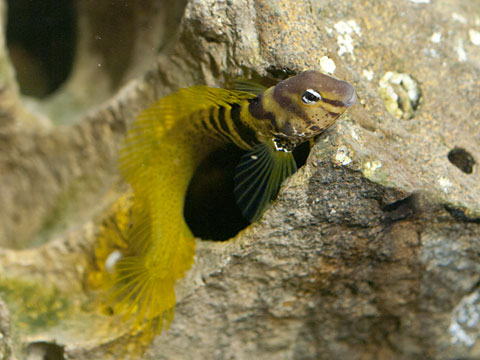 磯では毎年普通に見られ、魚を探して、水中を凝視している時などにヒョロヒョロッと出てきます。自分の体がスッポリと入る小穴を好む。 口の奥側に一対の犬歯があり、素手で捕まえようとして咬まれることがある。チクリとして血が滲む。 愛嬌のある顔に、動物のような仕草、見ていておもわず微笑んでしまいそうです。 底の掃除屋さんとして重宝され、人畜無害のお魚ですので是非あなたの水槽に一匹どうぞ。(但し、他の方では被害報告有り・・・) |