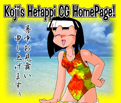 結構気に入っていた作品。そのせいか表示していた期間はこれがいちばん長かったんじゃないだろうか。 世間が夏休みになって「暑中見舞い」代わりに作った作品。初めてマイコ一人だけのタイトルCG。 お盆過ぎにUPした作品。お盆過ぎなのに「暑中見舞い」と、書いてしまい、赤面しながら「残暑見舞い」に書き換えた作品。 2万アクセス突破を記念して作った作品。期間限定Macromedia Flash2を使い作ってみました。と、言っても元の絵は上のCGから流用したもの。簡単なアニメーションです。 <タイトルCG>に戻る