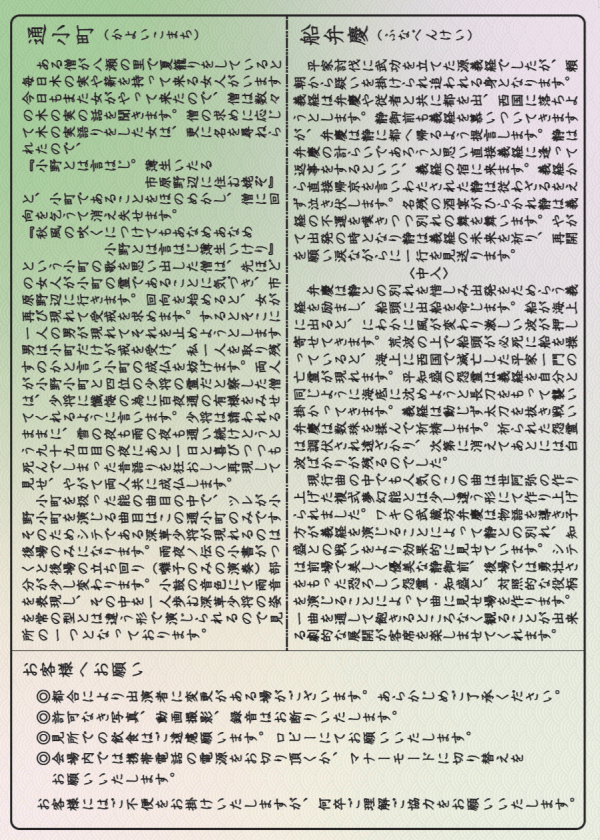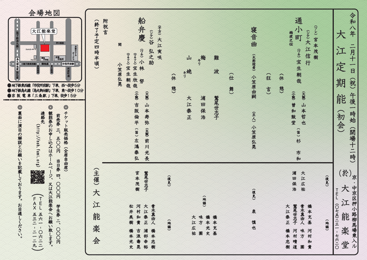 電話 自宅(075-561-0622) 能楽堂(075-231-7620)にてお願いいたします 各回の番組は出来上がり次第、載せていきますのでお待ちください。(演能日より約1ヶ月前に掲載予定)