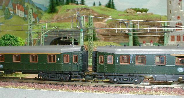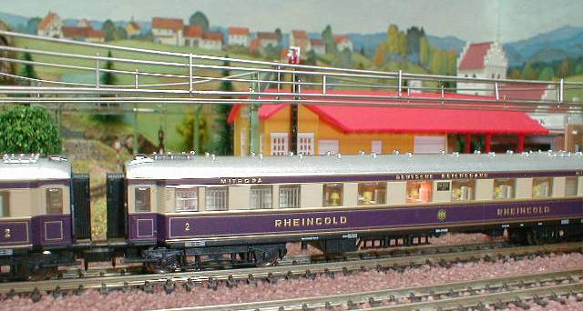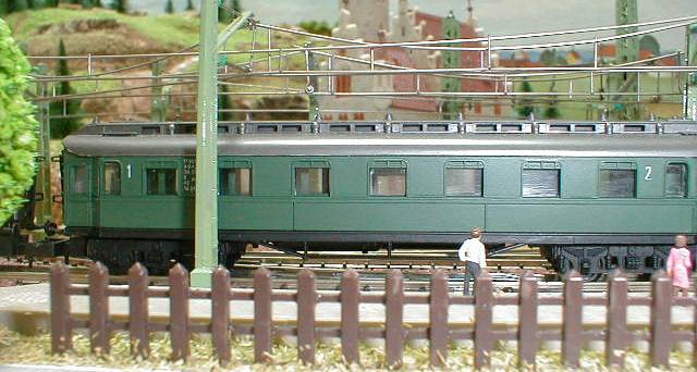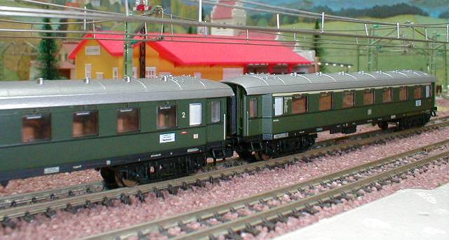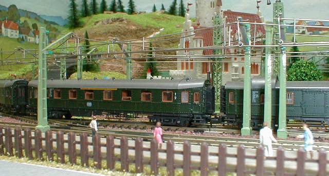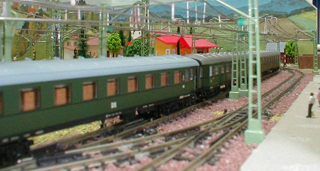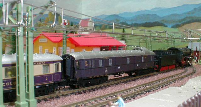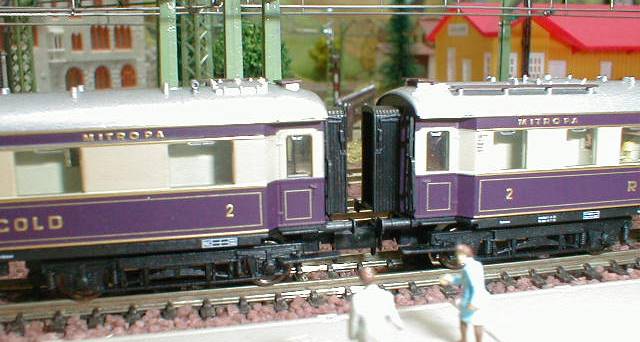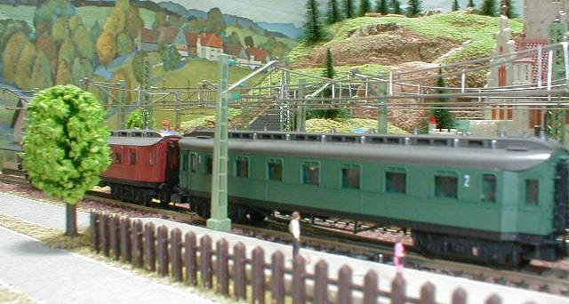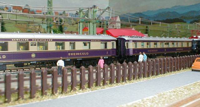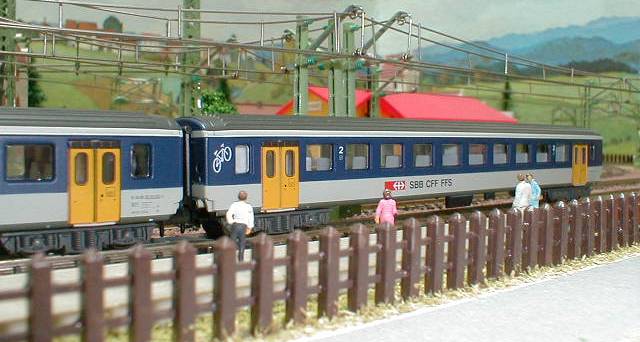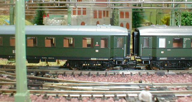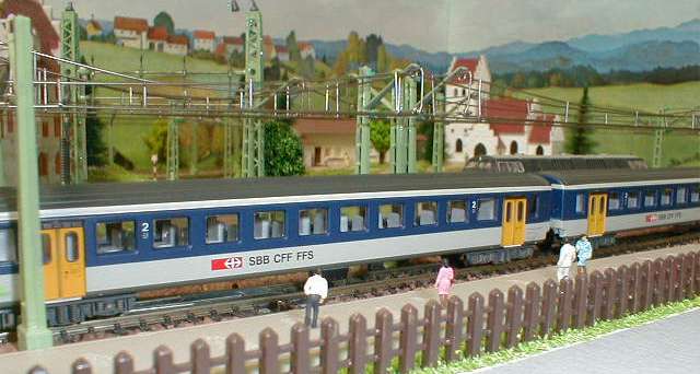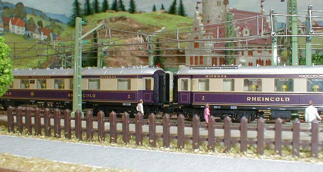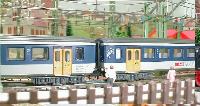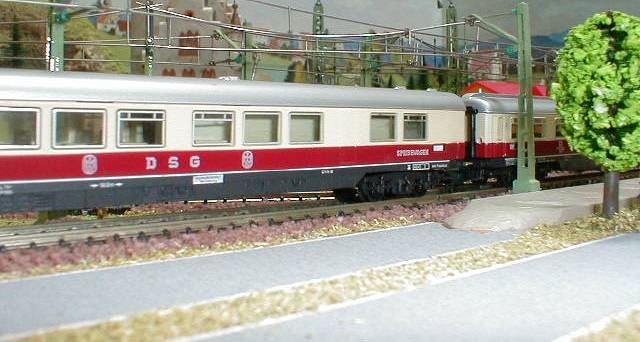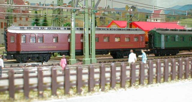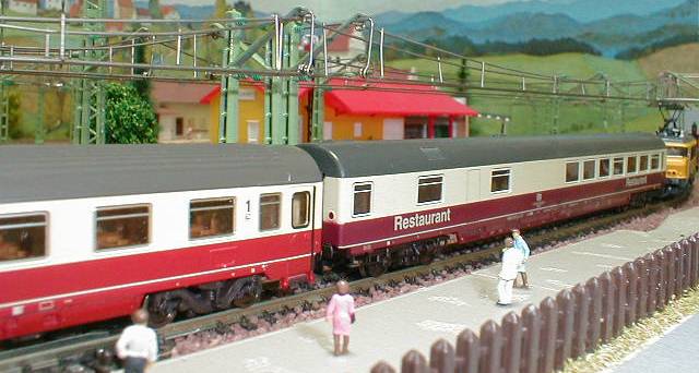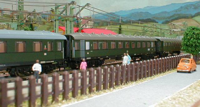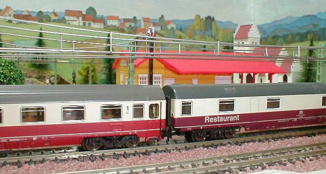 | スイス、ドイツ、フランスなど国によって個性的なカラフルな車体があるようです。昔はグリーンな車両が一般的でしたが、90年代のIR(インターレギオ(急行))、IC(インターシティ(L特急))、EC(ユーロシティ(国際特急))の活躍でアイボリーに紫や赤の帯び付きの客車が主流になりました。一方で、古い食堂車では運営会社のシンボルとして茶色などに塗られていました。 |