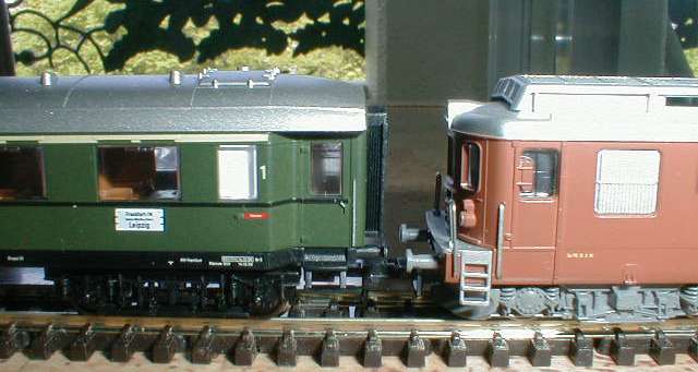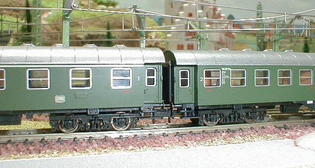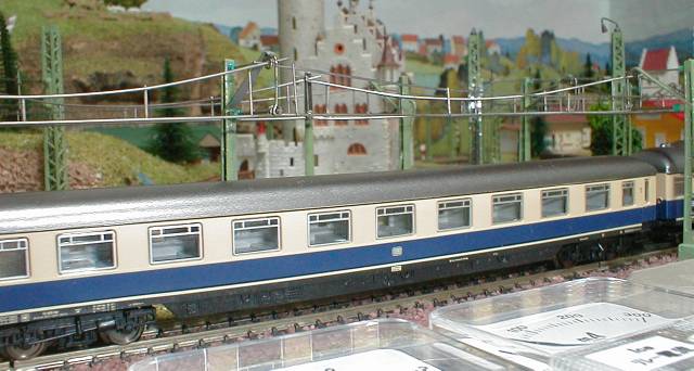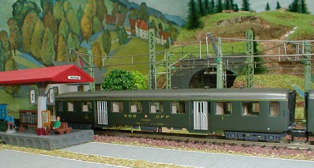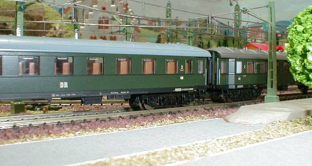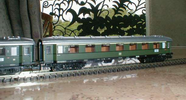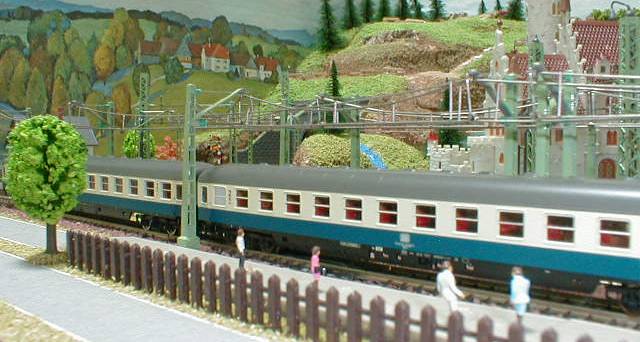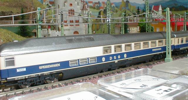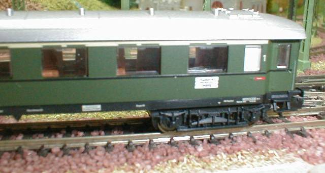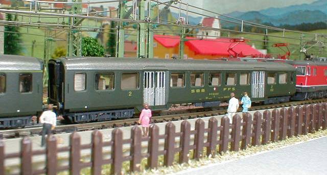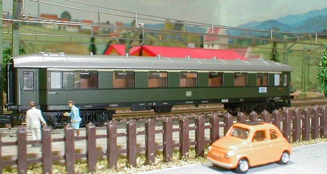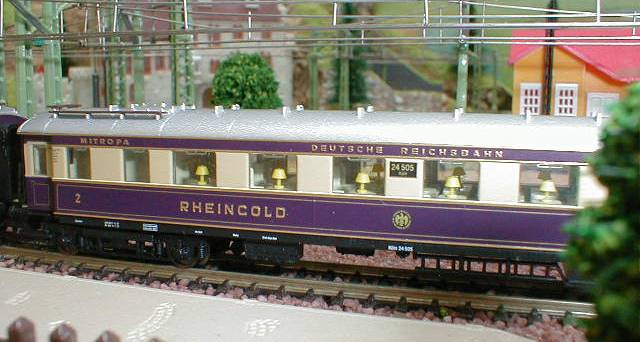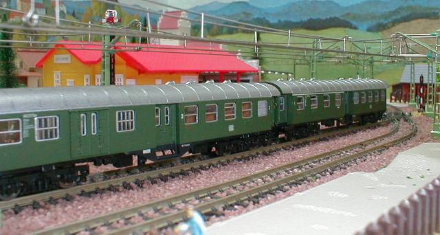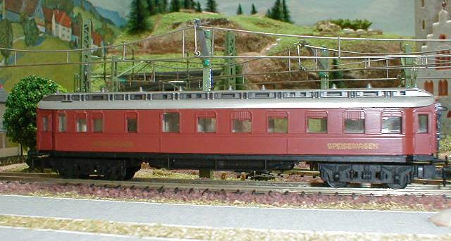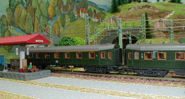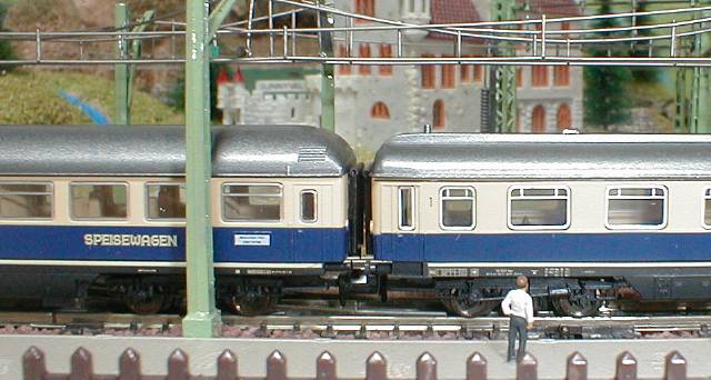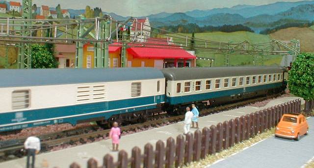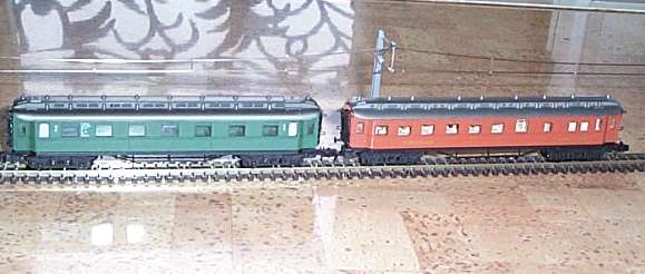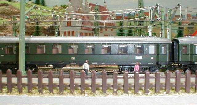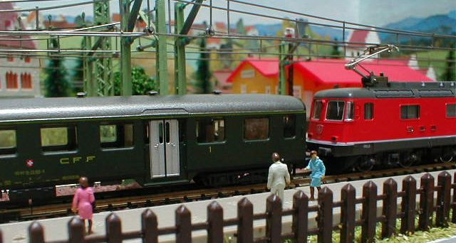 | スイス、ドイツ、フランスなど国によって個性的なカラフルな車体があるようです。昔はグリーンな車両が一般的でしたが、90年代のIR(インターレギオ(急行))、IC(インターシティ(L特急))、EC(ユーロシティ(国際特急))の活躍でアイボリーに紫や赤の帯び付きの客車が主流になりました。一方で、古い食堂車では運営会社のシンボルとして茶色などに塗られていました。 |