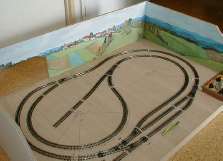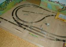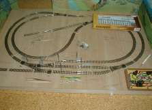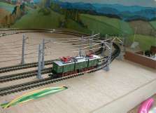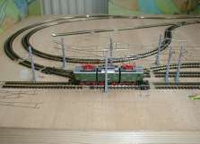 | ポイント部分から貼り始める。カテナリーマストは犬釘で止める。架線が突っ張らない様に一本づつ順に位置決めしていく・・。 | パンタが引っ掛からない様(段差が付かない様)、分岐部分(ポイント)にカテナリーマストがくるようにする。 | ||||||||||||||