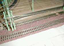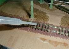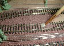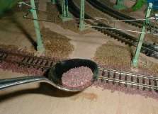 バラストは国産品、輸入品など数多く発売されています。この中から気に入ったものを選んで、使用します。粒はなるべく小さ目のものがレールとのバランス上フィットする様です。霧吹きで湿らせた後、ボンド水をレールにかからない様にスポイトでたらし、固めます。ちなみに、ここではBUSCH製の細目を使っています。色合いが、欧州の道床に似ています。