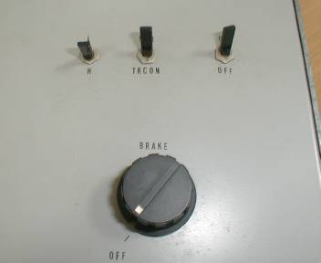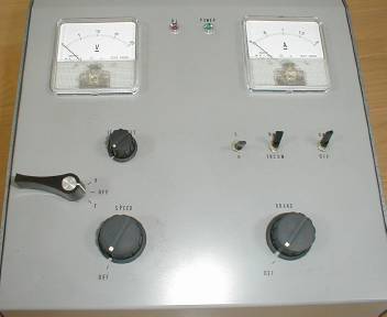 | 盤面には通常のスピードダイヤル(パルス制御(注2)の加速ボタン)の他に、ブレーキダイヤル(減速ボタン)があります。緩行運転を楽しめる様に設計しているわけですネ。現在はカトーやトミックスからも運転台形式のパワーパックが完成品の形で市販されていますが、当時としては、珍しい斬新なアイデアだったと推察します。 |