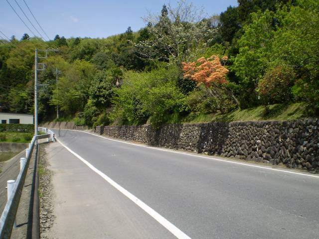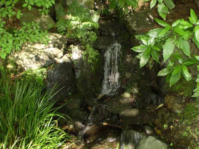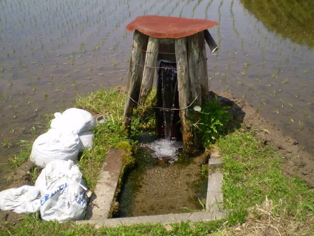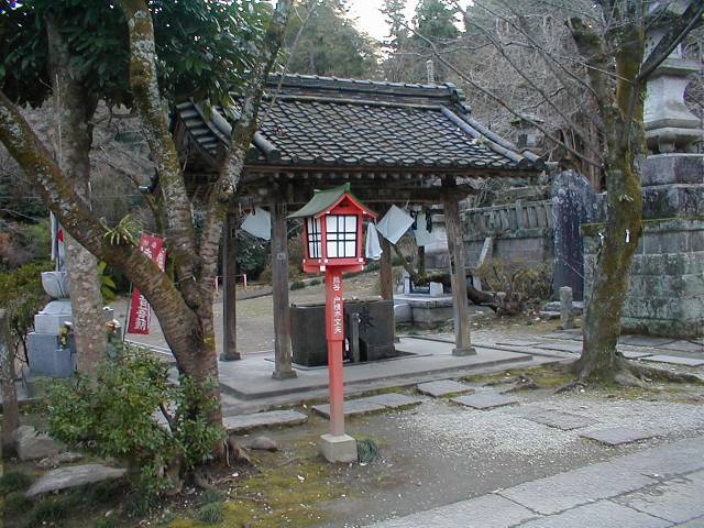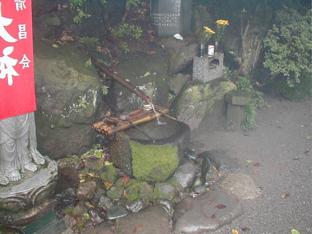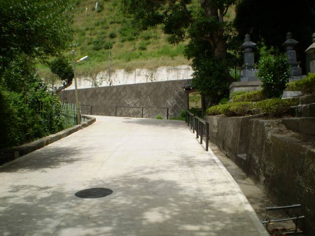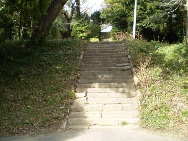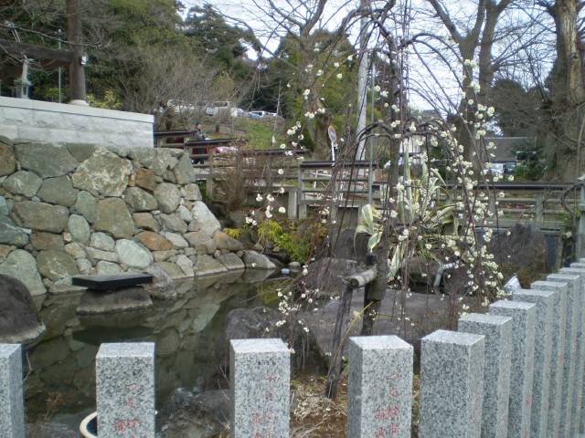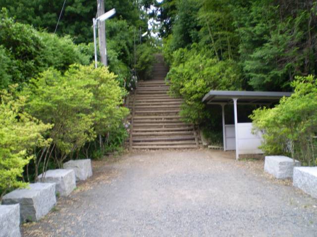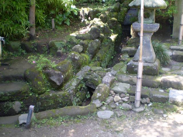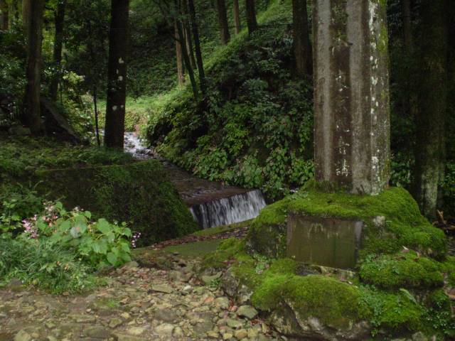 石段と白いのぼり旗|門柱|湧水を流す側溝|