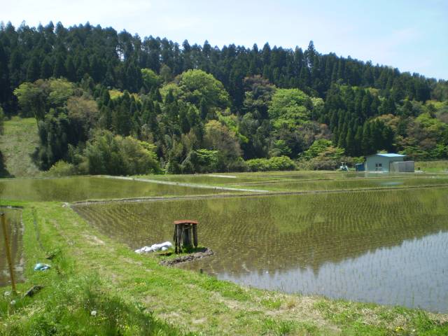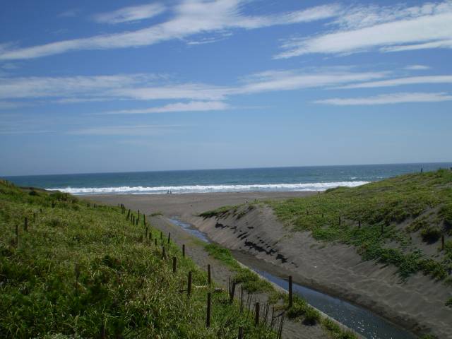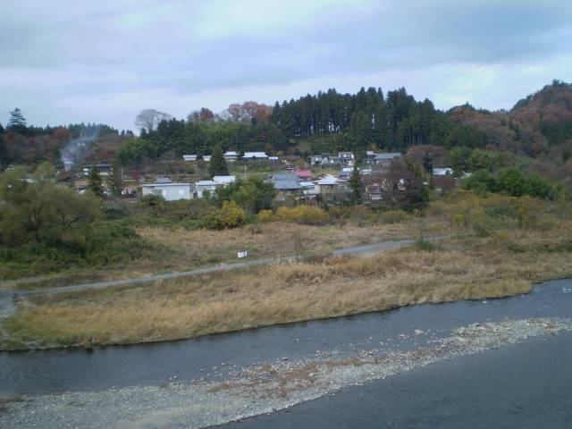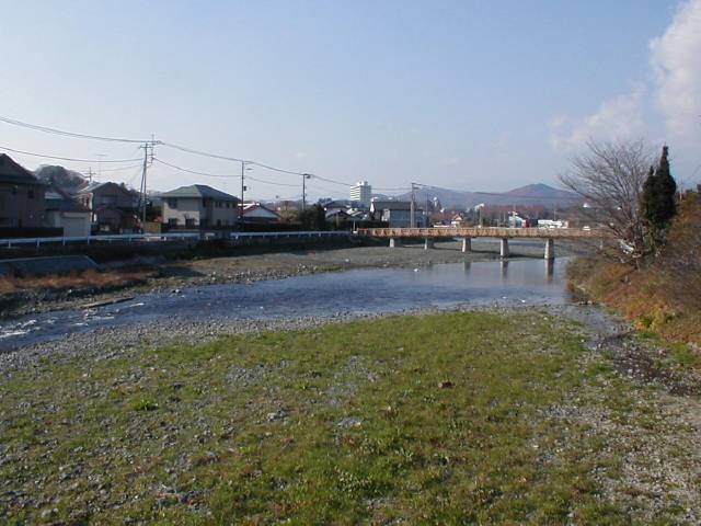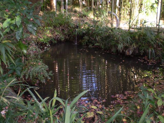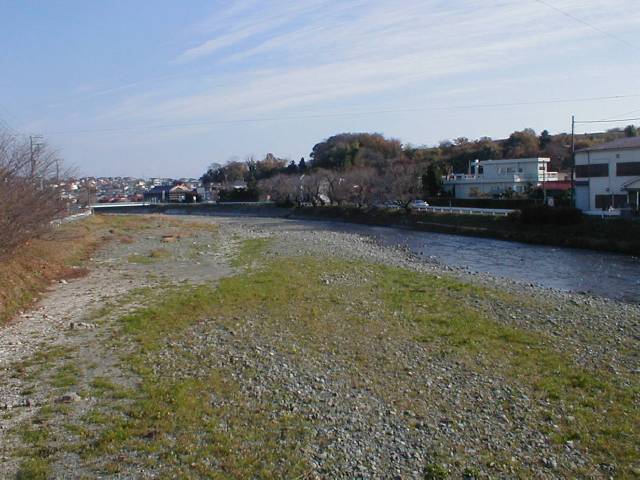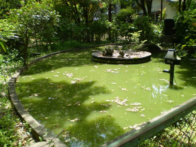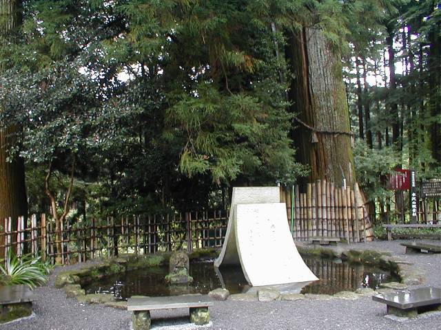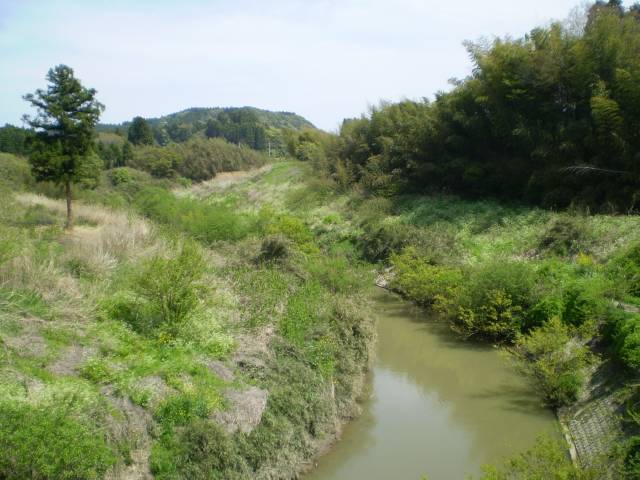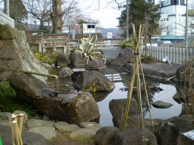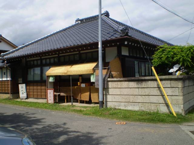 石段と白いのぼり旗|門柱|湧水を流す側溝|