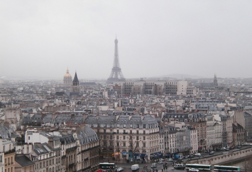 | 2003年の2月ごろ、娘は友達とパリに行きました。その時のみやげ話を聴きました。それに沿って写真をまとめました。近郊への小旅行ではシャルトル大聖堂も見学できるし、市内観光やTGVなどを含め色々楽しめるそうです。冬のパリはドンヨリとした曇り空だったそうです。気温は相当低そうで、日陰には雪が写っていました。上の写真はセーヌ川にあるシテ島(中州)からのパリ市内の様子とのこと。比較的フラットな風景は欧州の町並みらしさが伝わりますが、遠方にはエッフェル塔、私にはユトリロの絵のような雰囲気に見えます。 |