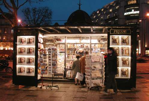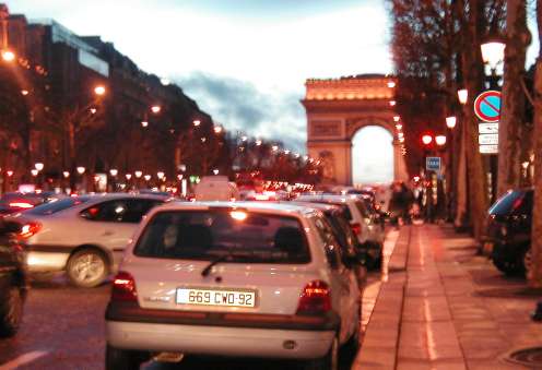 | 街頭の売店はキヨスクとみやげ物やさんをかねている様です。絵葉書なども置いている模様。夕方のシャンゼリゼ道りは車でいっぱい。東京の表参道あたりの雰囲気です。しかし、凱旋門がすばらしいですね。また、雪が積もったホーム写真の石垣がたまたまリーベ鉄道のそれとデザインがそっくりなのにビックリ!?(よくあるタイプなのか?偶然なのか・・) |