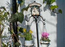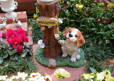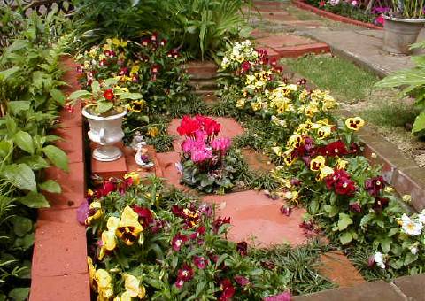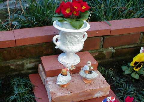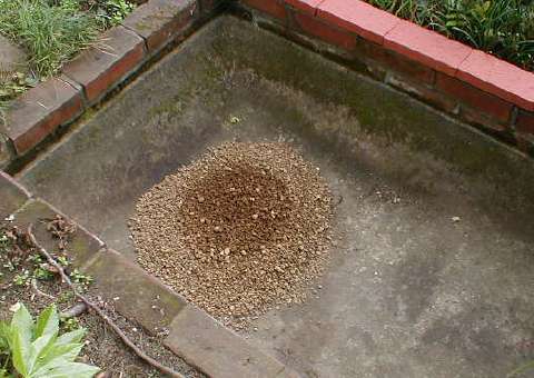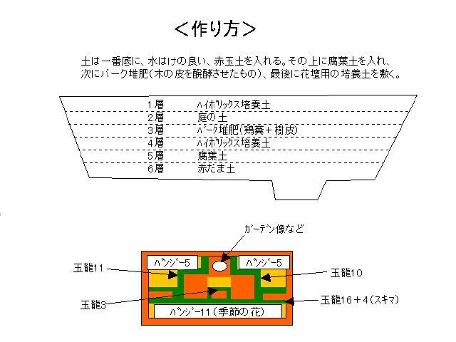 涸れた池を改造した手作りのプランター。 最初に水はけが良い赤玉土を底に敷く。 ガーデンオーナメントでメルヘンの雰囲気を演出。 作り方 全景 |