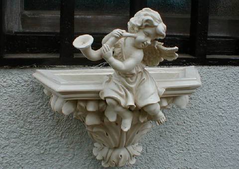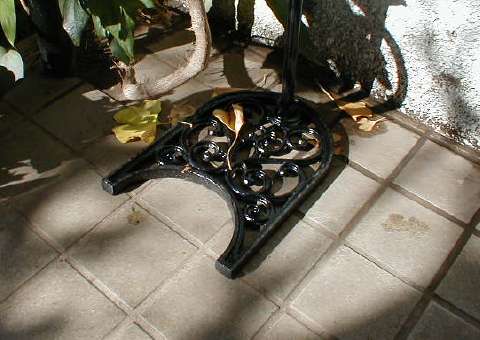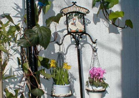WELCOMEフラワースタンド 艶だしとさび止めをかねて最初に透明ニスを塗っている。 050104 鋳物製スタンドの土台 天使の壁掛け花瓶 古窓の前のエンゼル 排水樋の前のぶどうの敷石 (東京エムトレ提供) |