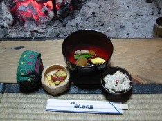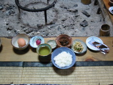 | 頭からがぶりっ! | お腹いっぱい! でも美味しい山菜御飯 | 翌朝の囲炉裏風景 |